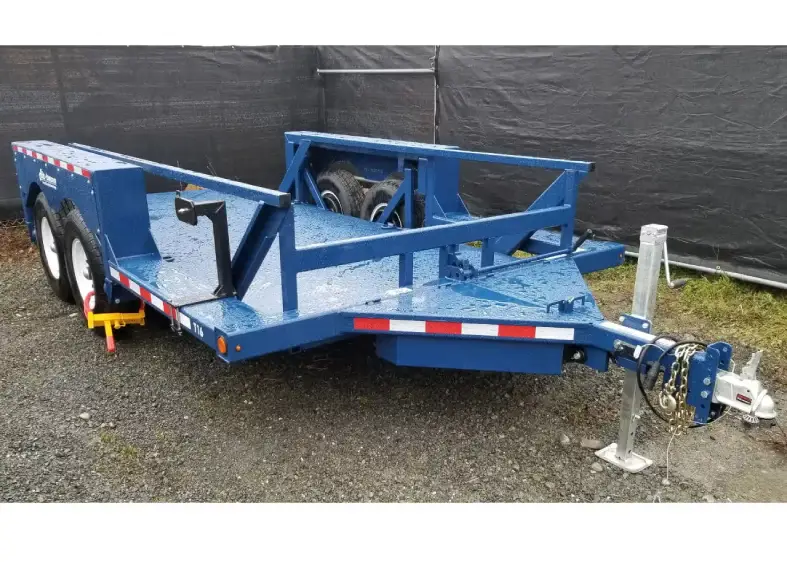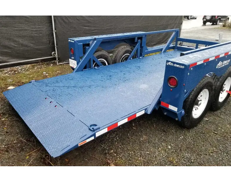 The Air-tow T16-14 Drop Deck Trailer is designed for heavy-duty transport, offering a 16-foot deck and a 14,000 lbs capacity.